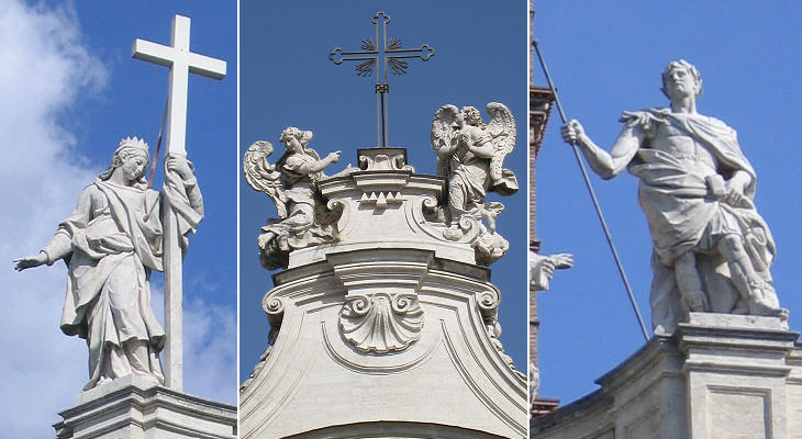 The façade is crowned by gigantic statues. One of them portrays Emperor Constantine, the son of St. Helena, as if he were a saint (for the Greek Orthodox Church he is a saint). You may wish to see a gigantic statue of Constantine by Gian Lorenzo Bernini and one of St. Helena by Andrea Bolgi, one of his assistants.