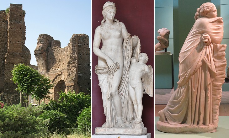 (left) Tempio di Venere e Cupido; (centre) Musei Vaticani: the statue which was found in the "temple" and after which it is named; (right) Centrale Montemartini: statue of a muse leaning on a rock pillar which was found in 1928 in a new development to the east of the "temple"