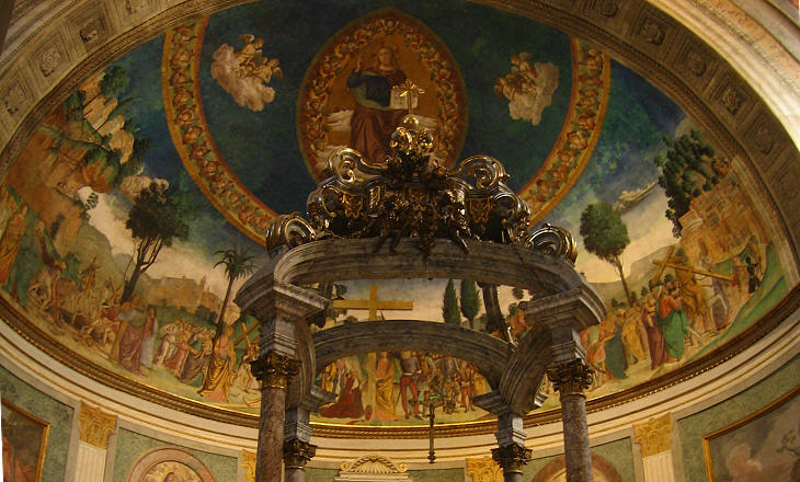 Baroque canopy and apse with late XVth century frescoes depicting events associated with the True Cross (you may wish to see the frescoes by Piero della Francesca at Arezzo depicting the same subject)