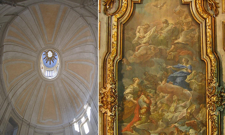 (left) Dome of the vestibule: its neat stucco decoration recalls patterns established by Borromini at Cappella dei Re Magi; (right) detail of an oil painting by Corrado Giaquinto on the ceiling of the main nave
