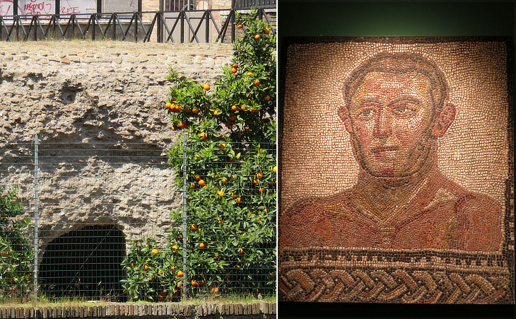 In 1959 evidence of the floors of two Roman houses was identified at the foot of the aqueduct/city walls, but only in 2016 a thorough restoration of them was carried out. They testify to the excellence of the technique used by the Romans to make floor mosaics. One of the houses is named after portraits of a man and of a woman at the centre of floor mosaics of two adjoining small halls which are decorated with leaf scrolls and birds.
