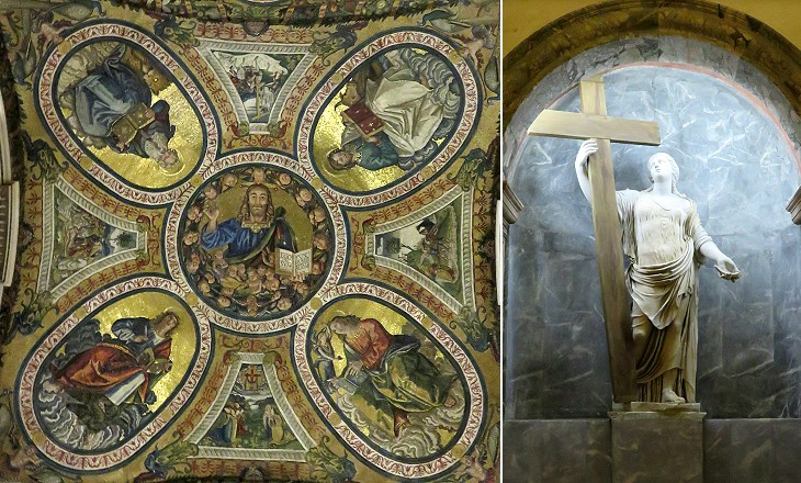 Cappella di S. Elena: (left) mosaic of the ceiling; (right) ancient statue of Juno found at Ostia and turned into a statue of St. Helena in the XVIIIth century