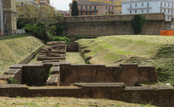 Remaining evidence of Circus Varianus and the walls of Rome in the background; the modern building to the left of the circus houses Museo Nazionale degli Strumenti Musicali