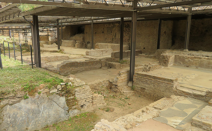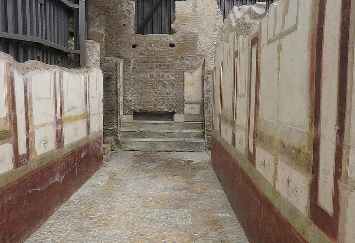 The rooms were slightly below the level of the ground which explains why they were not entirely destroyed when the area near the walls was cleared. There are still three marble steps at the end of a painted corridor which has a particular kind of floor mosaic made up of grey and yellow marble pieces (see a similar floor mosaic at Villa dei Quintili). In the early IVth century, similar to the houses along the aqueduct, the house of Aufidia was inhabited by an imperial officer.