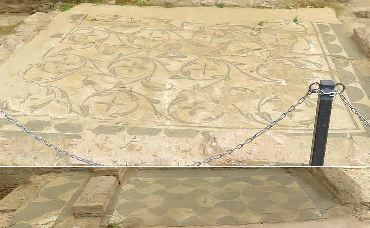 Floor mosaics: (above) Casa dei Ritratti; (below) Casa delle Fontane (House of the Fountains) see a similar floor having an optical effect at Tomba Barberini