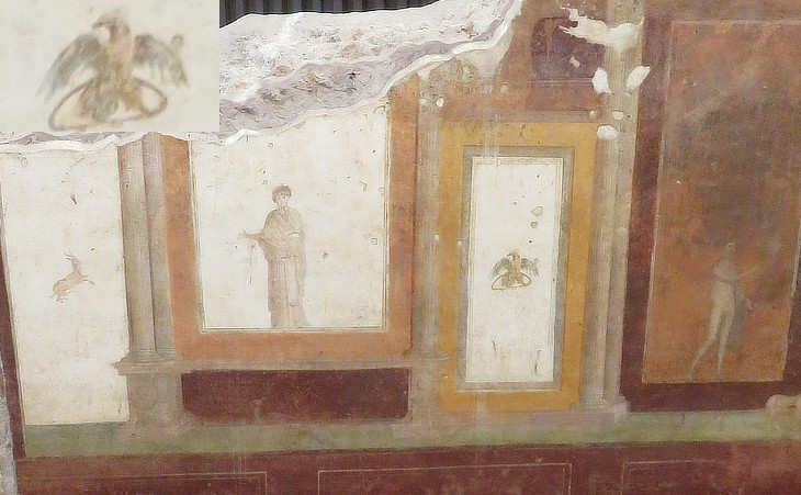 The paintings follow typical Roman patterns with fake architectures framing large sections of the walls with a single subject at the centre of a wide space. The colours are chiefly red, yellow and white. You may wish to see Insula delle Ierodule at Ostia or House of the Red Walls at Pompeii for other similar paintings.