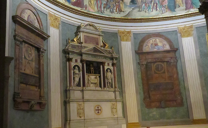 Funerary monuments in the apse: (left) Cardinal Bernardino Lopez de Carvajal (d. 1523 - the painted frame is a late XVIIth century work); (centre) Cardinal Francisco Quinones (d. 1540); (right) painted empty monument