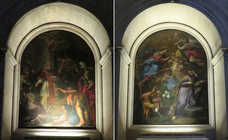 Altars for pilgrims to pray in their visit to the Seven Churches (see those at S. Pietro): (left) Pope St. Sylvester shows the images of Sts. Peter and Paul to Constantine; (right) Vision of St. Robert's mother (ca 1670)