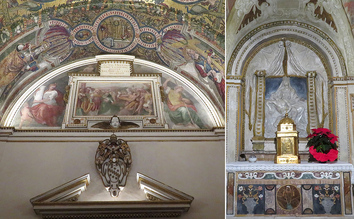 (left) Cappella di S. Elena: coat of arms of Pope Clement VIII and fresco depicting the search for the Cross between allegorical symbols; (right) Cappella Gregoriana: Pietà