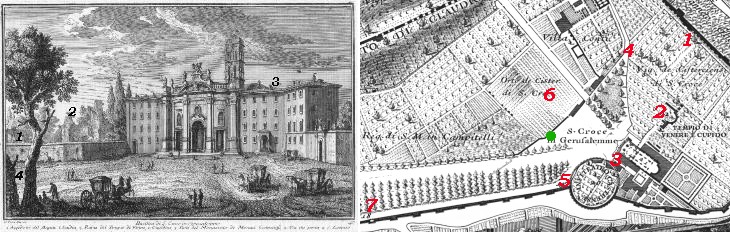 3) Monastery; 4) Street leading to Porta S. Lorenzo. 1) is covered in another page. The small map shows also 5) S. Maria del Buon Aiuto; 6) Terme Eleniane; 7) Oratorio di S. Margherita.