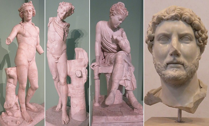 (left) Centrale Montemartini: three statues found in 1887 at Horti Liciniani: they portray (left to right): Dionysus, a satyr and a seated maiden; (right) Museo Nazionale Romano: head of Emperor Hadrian which was found near Tempio di Minerva Medica