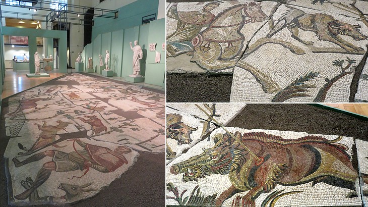 Centrale Montemartini: mosaic found in the area of Horti Liciniani and details showing a boar hunting scene