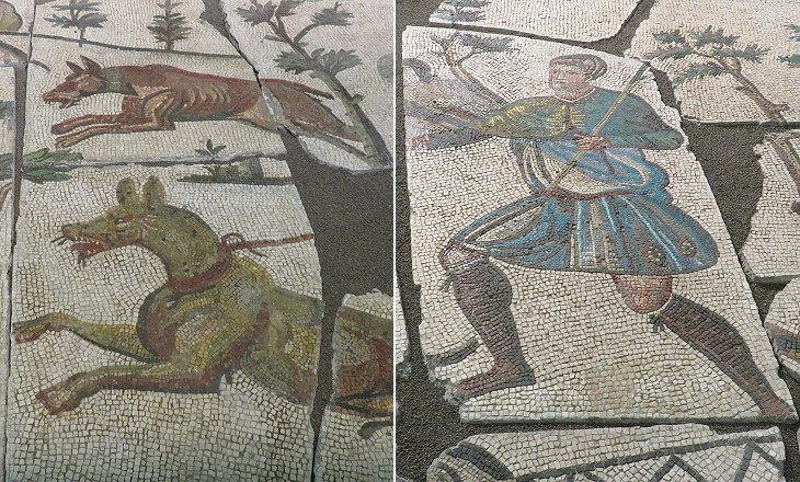 The hunters all wear heavy clothes which is another remarkable deviation from tradition. Some details recall scenes of a large mosaic of the palace of Emperor Justinian at Constantinople or one at Villa del Casale in Sicily and more in general Roman mosaics of Algeria and Tunisia.