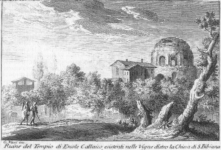 At Vasi's time this large circular building was thought to be a temple to Hercules built by Decimus Junius Brutus, a Roman general who in 137 BC led a series of campaigns in the north-western part of the Iberian peninsula where a region of Spain is still known as as Galicia. The Roman Senate granted him the title of Callaicus. The building was also known as Tempio di Minerva Medica after a statue which was reportedly found there at the beginning of the XVIIth century (but today archaeologists believe it was found elsewhere, perhaps at Campo dei Fiori or at Piazza della Minerva): it portrayed the goddess with a snake, a symbol of Medicine. It is known as Athena Giustiniani because it was part of the Giustiniani collection. You may wish to see a bronze head of Minerva Medica which was found at Bath.