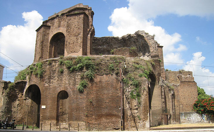 The nymphaeum stands close to the Tre Archi, by which all the railway lines enter the city and is the first ruin to strike the eye of the stranger on his entering the walls of the Eternal City.