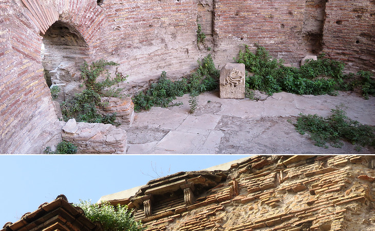 (above) Evidence of heating system in one of the niches, which most likely housed the couch of the emperor/landlord; (right) remaining decoration of the external cornice of the dome