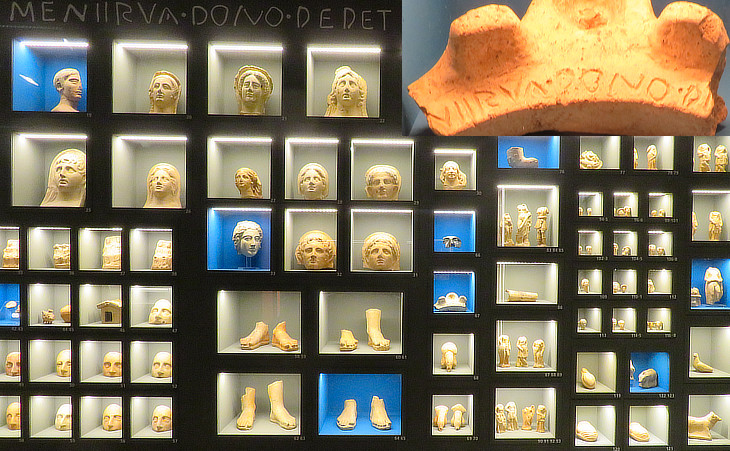 Temporary exhibition at Musei Capitolini: terracotta objects from a shrine dedicated to Minerva; (inset) fragment of a lamp with a dedicatory inscription