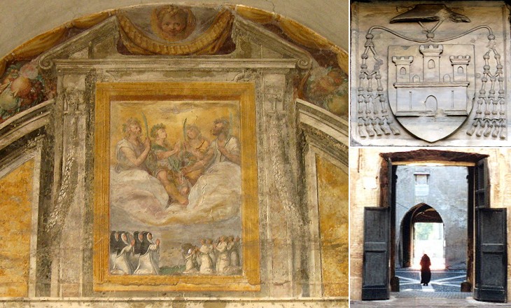 (left) Fresco above the entrance to the church depicting Augustinian nuns and orphans praying to the Four Crowned Martyrs; (right-above) coat of arms on the tower; it belongs to Cardinal Alfonso Carrillo de Albornoz, nephew of Cardinal Gil de Albornoz, who promoted a restoration of the complex in the early XVth century; (right-below) a nun on her way to Rome (also in the image used as background for this page)