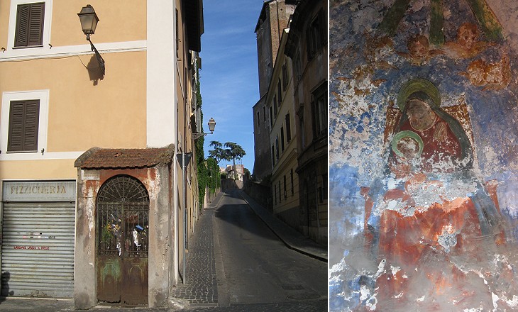 (left) Sacello della Madonna and Via dei SS. Quattro Coronati; (right) sacred image