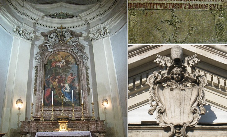 (left) Main altar with a painting by Gaetano Lapis depicting the beheading of the two martyrs; (right-above) 1256 relief showing the two saints and a phoenix, symbol of Resurrection, above a branch of tree; (right-below) coat of arms of Pope Benedict XIV (shown because of the angel's kiss curl)