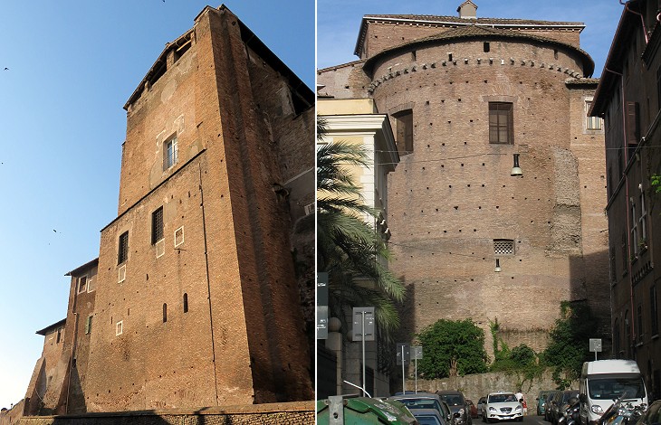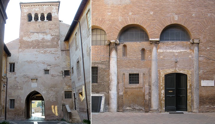 (left) Tower of the outer courtyard and the exit to Rome; (right) inner courtyard: columns which separated the nave from the right aisle