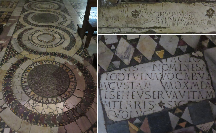 (left) Detail of the floor with "opus Alexandrinum" decoration (it will evolve into Cosmati work); (right) Christian tombstones: (above) Tertulla who lived 21 years and to the left fragment of a relief depicting the three youths in the furnace; (below) the epithaph is composed of elegiac couplets