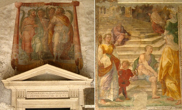 (left) Fresco depicting the Four Crowned Martyrs above the entrance to the office of the stonecutters' guild; (right) late XVIth century fresco in the outer courtyard depicting the Presentation to the Temple