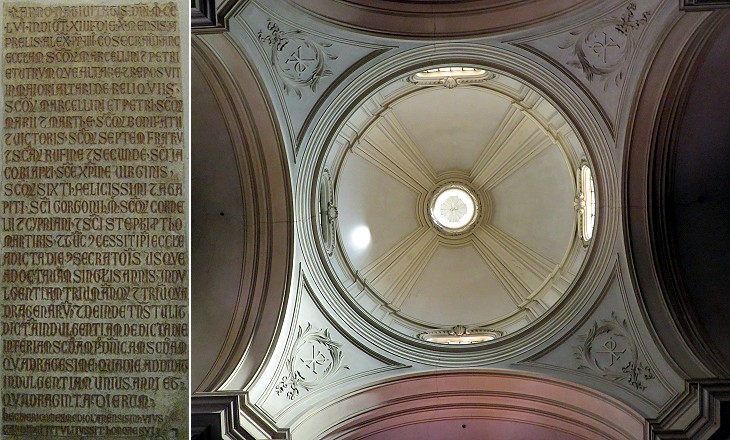 (left) 1256 inscription celebrating the restoration of the church and the relocation of the saints' relics; (right) interior of the dome