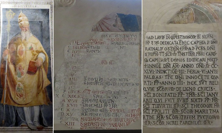 (left) Pope St. Sylvester I in a fresco attributed to Raffaellino da Reggio (after 1570); (centre) a XIIIth century calendar with names of saints in the antechamber of the oratory (see a similar ancient calendar at Veroli); (right) 1246 inscription celebrating the construction of the oratory and the relocation of relics to it