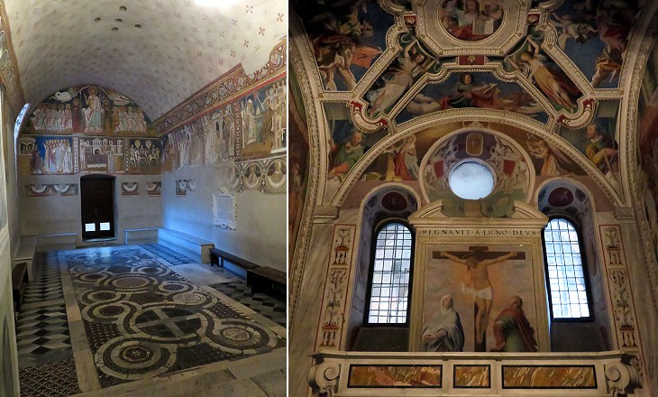 (left) View from the altar; (right) frescoes behind the altar attributed to Raffaellino da Reggio