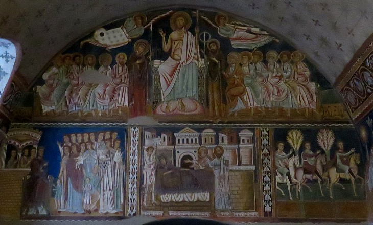 We see Constantine dismissing, consoled and laden with gifts, the mothers whose children were to be slaughtered to provide a bath of blood, the remedy prescribed - but which he humanely rejected- - for his leprosy, his punishment for persecuting the Church while he yet lingered in the darkness of paganism; we see the vision of St. Peter and St. Paul, who appear to him in his dreams, and prescribe the infallible cure for both physical and moral disease through the waters of baptism; we see the mounted emissaries, sent by the emperor to seek St. Sylvester. (..) The largest composition on these walls, which completes the series, represents the Saviour enthroned, amidst angels and apostles. Hare