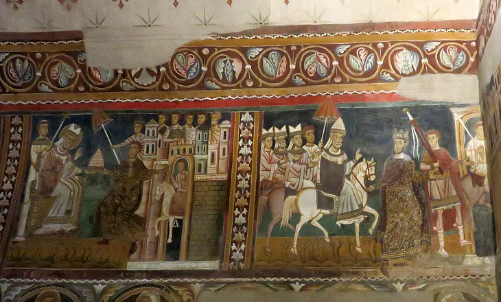 XIIIth century frescoes depicting Emperor Constantine offering the tiara (papal crown) to Pope St. Sylvester I (left) and the Emperor escorting the Pope to Rome (right)