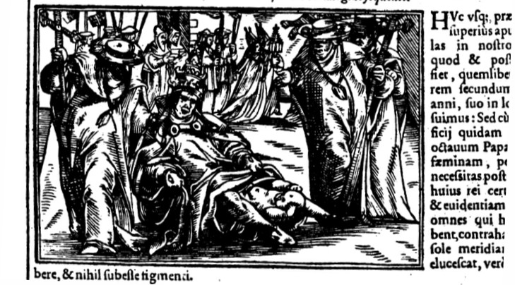 The delivery of Pope Joan; illustration from Johann Wolf, Lectionum memorabilium et reconditarum (1600)
