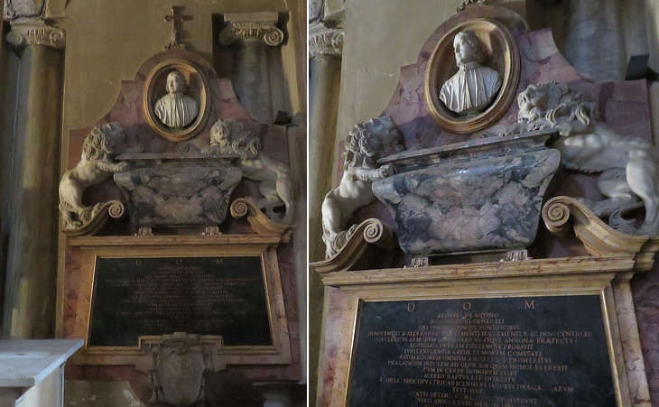 The monument was erected by his brothers Andrea who was Bishop of Tricarico and Giacomo who was Duke of Carsoli, both towns being in the Kingdom of Naples. He worked under five popes from Innocent X to Innocent XI and he held important positions in the government of the Papal State. The monument shows some characteristic features of Baroque monuments i.e. the use of coloured marbles, the head of the dead turned towards the altar, references to heraldic symbols (the lions), but there is no record of which sculptor designed it.