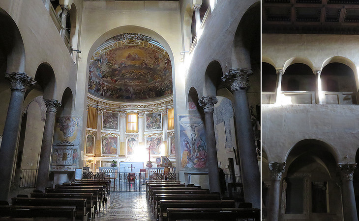 The interior of the church retains the 1621-1627 decoration of the apse, but most of the other additions to the medieval church were removed in 1912-1916. Galleries reserved to women or catechumens can be seen also at S. Agnese and S. Lorenzo fuori le mura.