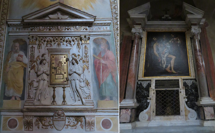 (left) Repository for the Holy Oil with the coat of arms of Pope Innocent VIII attributed to Andrea Bregno or Luigi Capponi; (right) Altarpiece portraying St. Sebastian being removed by the pious matron Lucina from the sewer where he had been thrown into; the reliquary containing the head of the martyr is behind the altar