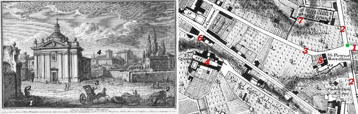 SS. Pietro e Marcellino was located at the intersection of two important streets, but it was surrounded by villas (e.g. Villa Giustiniani Massimo, of which Vasi shows a portal opposite SS. Pietro e Marcellino) and farmed areas so that the view has a landscape atmosphere rather than an urban one. In the background Vasi showed SS. Quattro Coronati, a church which retained its medieval appearance.