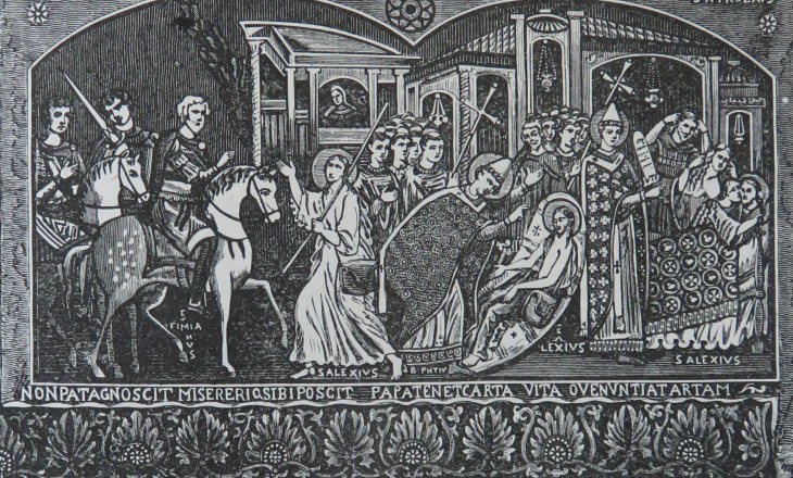 Called from a palace to a pilgrimage, from Roman espousals to a hermit's life, in a hut near our Lady's church at Edessa; in youth's bloom to the austerity of solitary old age; from wealth to privations; in privations to return home, not as the prodigal son, but, that hardest trial of merely human nature, to his birth-place, self-stript of its ties and associations, to parents no longer known as a child, forgotten by all, a mendicant asking for charity, and with no place to lay his head; this young nobleman of the fifth century, Alexius, has bequeathed to the city of the Pontiffs an imperishable name. The artist, who painted the subject we are about to treat of, seems to have felt that the sweet odour of grace was wafted from that story of inspired devotion, and to have sought for appropriate ornament. The honey-suckle supplies the border below the picture of his death. (..) In the painting we see him on his return to Rome, in the garb of a pilgrim, with his wallet and staff, accosting Euphimianus who is on horseback followed by two attendants, and evidently asking hospitality of him. Euphimianus is pointing with his right hand to his palace (from the balcony of which a lady is looking), and saying to Alexius: «That is my residence, in it you shall find an asylum». During his stay in his father's house he wrote an account of his life, but would not consign the manuscript to any one. At length, sickness came upon him, and he died holding the manuscript in his right hand with so stiff a grasp, that it could not be removed. At that moment the bells of the adjacent church began to ring a joyful peal, of their own accord. The inhabitants of the neighbourhood were seized with astonishment: the phenomenon could not be explained. After a little the news reached S. Boniface who then governed the Church. Euphimianus requested him to come and explain the marvel. The Pope consented, and he went up to the Aventine accompanied by his clergy and cross-bearer. On his arrival at Euphimianus' palace, he was conducted to the staircase where the dead pilgrim lay. He recited a short prayer, and leaning towards the pilgrim he took, without any difficulty, the manuscript from his hand, and blessed him. Euphimianus is standing by with an expression of compassion, not knowing, of course, who the dead man was. A little more to the right of the spectator is depicted his recognition. He is laid on a bier covered with a rich and highly decorated pall. His aged parents tear their hair through grief for not having known him, and the bride covers his face with kisses. The inscription below says: "The father does not recognize who asks his pity - the Pope holds the scroll which tells his austere life". His interment was celebrated with great pomp by the whole city of Rome. (..) The final close of the devoted soul is well indicated by the words upon the scroll in the Pontiff's hands: «Come to me, all you that labour» (Mathew XI. v. 28). Mullooly