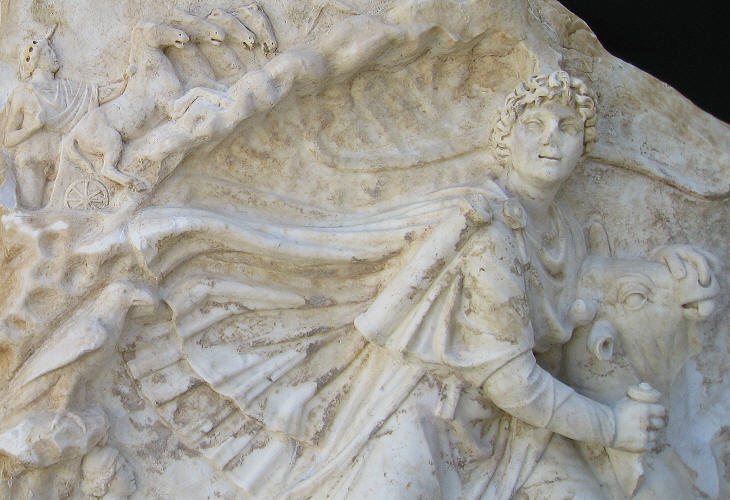 Museo dell'Agro Veiente: detail of a relief portraying Mithra slaying the bull (on the left the chariot of Sun and a raven, the first step of the initiation - see another section of this relief in a page covering S. Prisca); the "mithraeum" of S. Clemente is shown in the historical section