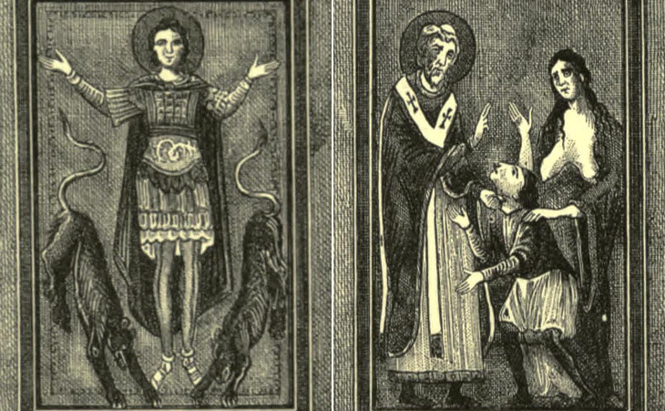 At the east end of the aisle, there are rude remains of a group of Benedictine subjects. (..) Libertinus, appears to have lived in the time of Totila. We have in the one with the inscription «ubi Abbas Libertino veniam petit» «where the Abbot begs pardon of Libertinus», an example of how human passions may break out in the peace of the cloister, and how meekness and humility may overcome them. The Abbot was not favourable to Libertinus. One day, in a rage, the Abbot, for want of a stick, took up his footstool and beat Libertinus severely with it about the head. He went quietly to bed, and early the next morning presented himself at the bedside of the Abbot, who thought that he was leaving the monastery, and that the abrupt departure of so holy a man would not serve his own reputation. Stung with remorse when he saw that Libertinus had come, as usual, to ask for his blessing, before setting out on the business of the monastery, he rose, and we see him prostrate on the floor of his cell while Libertinus gives him the benediction of forgiveness he had asked for. (..) On his journey to Ravenna, a woman with her dead child in her arms seized his mule by the bridle, and insisted that he should restore the child to life. The traveller could not escape, and so strange a demand alarmed his humility. Moved with compassion, he said: «Do not weep». At length he alighted (..) and whilst in prayer life returned. (..) The monk, who was the gardener, was annoyed by some one stealing the vegetables. He found out the place where the thief used to get in, and seeing a snake by it told him to keep guard. While the monks were at their siesta, the thief stepping over, as usual, took fright at the sight of the snake, and fell so that he hung in the hedge by the leg. The monk on returning released him, and quietly conducting him to the door of the monastery, gave him some vegetables, saying: "My son, why will you steal? If you want any more, come to me and I will give them to you". Mullooly