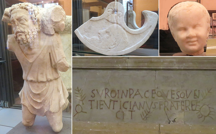 (left and above) Antiquarium at the entrance to the lower church: small statue of a shepherd carrying a lamb; marble "oscillum", the name indicates that it oscillated from the branches of a tree perhaps in a garden (see a very similar one at Barcelona); head of a child; (below-right) lower church: Christian funerary inscription