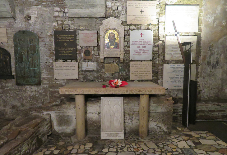 Lower church - southern aisle: Tomb of St. Cyril and many modern plaques celebrating him by countries which utilize his alphabet