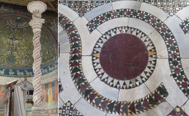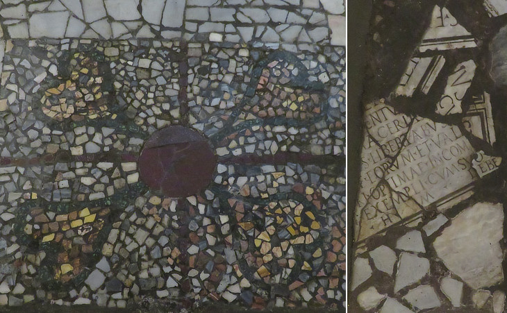 Lower church: main nave floor (see that of the upper church): (left) fragments of "opus Alexandrinum" (decorative marble inlays) with an unusual pattern; (right) fragments of Roman funerary inscriptions
