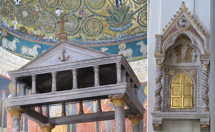 (left) Upper part of the Romanesque canopy, see some later Gothic canopies at S. Paolo fuori le Mura and S. Cecilia; (right) tabernacle for the Holy Oil
