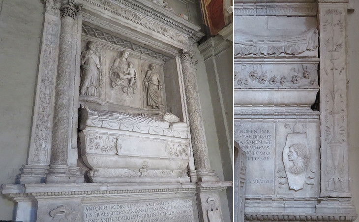 (left) Monument to Cardinal Antonio Jacopo Venerio attributed to Andrea Bregno; (right) detail of the Monument to Archbishop Giovanni Francesco Brusati (d. 1485), nephew of Cardinal Bartolomeo Roverella, by Luigi Capponi, a pupil of Bregno