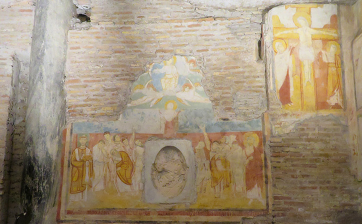 The Roman structures under the lower church are dated late Ist century AD and they belonged to a house including a IInd century AD mithraeum and to a large non residential building around a courtyard, perhaps a mint or a facility of Colosseo.