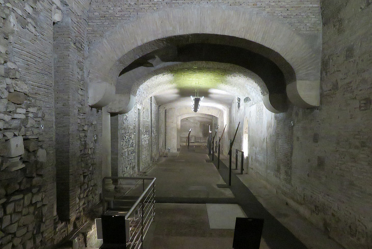 At the end of the left aisle are some ancient Roman stairs leading to several chambers of the Imperial Age (now flooded and inaccessible). Murray 1899