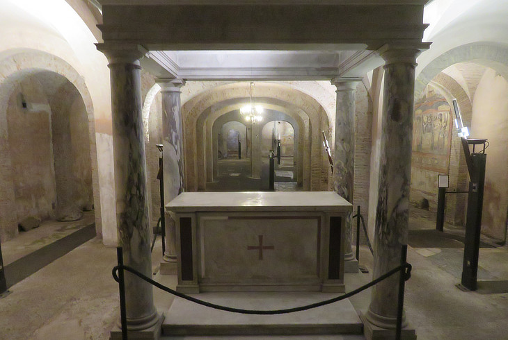 When we visit it, we cannot be blind to the inveterate faith with which Catholics venerate the relics of the dead, and the magnificence with which holy Church surrounds the bodies of the saints. For reduced, as this Constantinian basilica may be said to be in its present state, to mere brick and mortar, (..) we must replace what was carried up to construct the church above; the noble marble panels of the choir, and especially the two of basket-work - transennae - once probably protecting the relics of the saint; the various intricate patterns of the rich opus Alexandrinum of the pavement; if we add frescoes from top to bottom, and from end to end, elegant in their ornamentation, and harmonious in colouring; (..) if we introduce the lights and crowd, and priests at the high altar, we shall conceive no small idea of the Catholic basilica. Mullooly