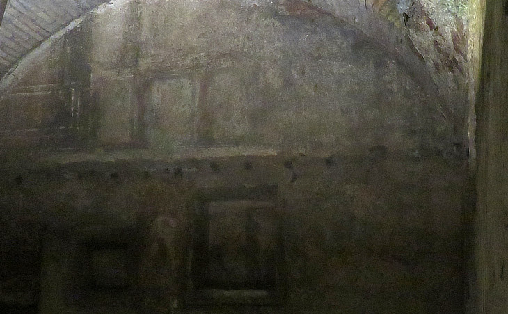 Lower church - nave: two frescoes (from Wey's book): (left) Daniel in the lions' den; (right) St. Blaise picking a thorn from the throat of a child