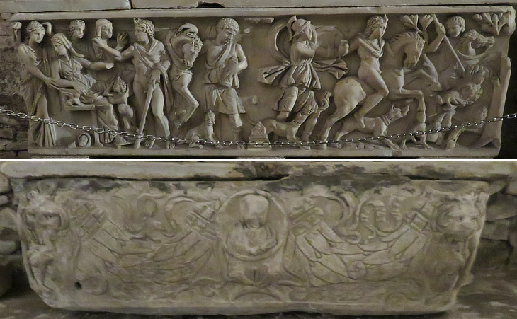Pagan sarcophagi which are now in the lower church: (above) Hippolytus (the young naked man) and Phaedra (sitting on a throne); (below) heads of lions, garlands and an unfinished portrait of the dead